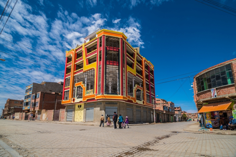 “Le dije: ‘si algún día va a haber una universidad acá, la planta baja tiene que ser un centro comercial, donde tú puedas alquilar para fotocopiadoras y librerías’”, relata Mamani a “El Mercurio”. “En la avenida Juan Pablo II, una de las principales de El Alto, siempre había entradas folclóricas. Si las fiestas se erigen en las plazas, las calles o en algunos locales, ¿por qué no hacemos un salón de eventos encima y también lo puedes alquilar? Encima, hacemos los departamentos y, por último, tu chalet en la última planta. Le di la propuesta y (el dueño) me dijo: ‘encantado. Hazlo y listo. Me encomiendo en tus manos’ (risas)”.